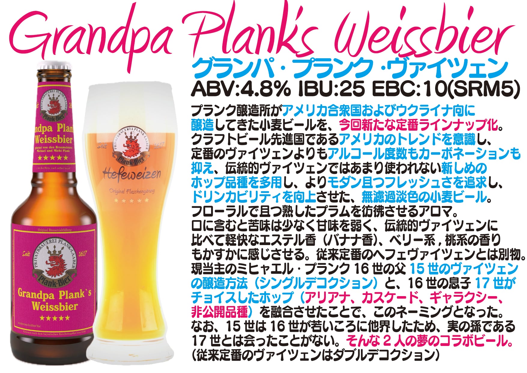 プランク醸造所がアメリカ合衆国およびウクライナ向に醸造してきた小麦ビールを、今回新たな定番ラインナップ化。クラフトビール先進国であるアメリカのトレンドを意識し、アルコール度数はやや低めに、カーボネーションも定番のヴァイツェンよりも抑え、従来の伝統的ヴァイツェンではあまり使われない新しめのホップ品種を多用し、よりモダン且つフレッシュさを追求し、ドリンカビリティを向上させた、無濾過淡色の小麦ビール。